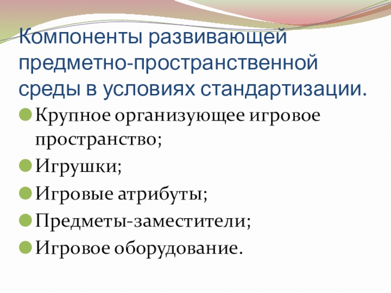Компоненты развивающей предметно-пространственной среды в условиях стандартизации.Крупное организующее игровое пространство;Игрушки;Игровые атрибуты;Предметы-заместители;Игровое оборудование.