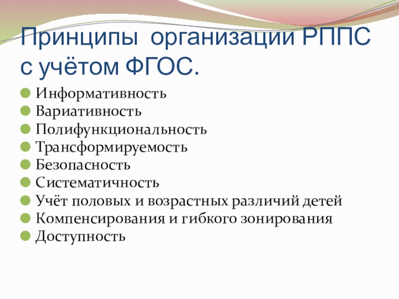 Принципы организации РППС с учётом ФГОС.ИнформативностьВариативностьПолифункциональностьТрансформируемостьБезопасностьСистематичностьУчёт половых и возрастных различий детейКомпенсирования и гибкого зонированияДоступность