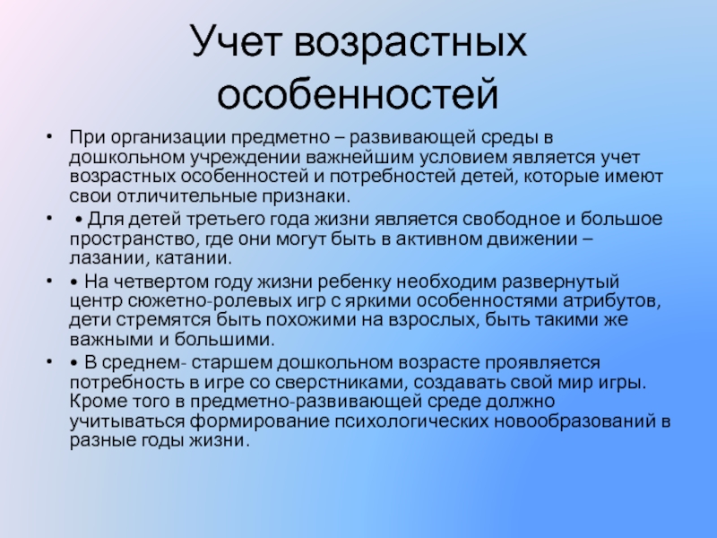 важнейшим условием является учет возрастных особенностей и потребностей детей, которые имеют свои отличительные признаки.