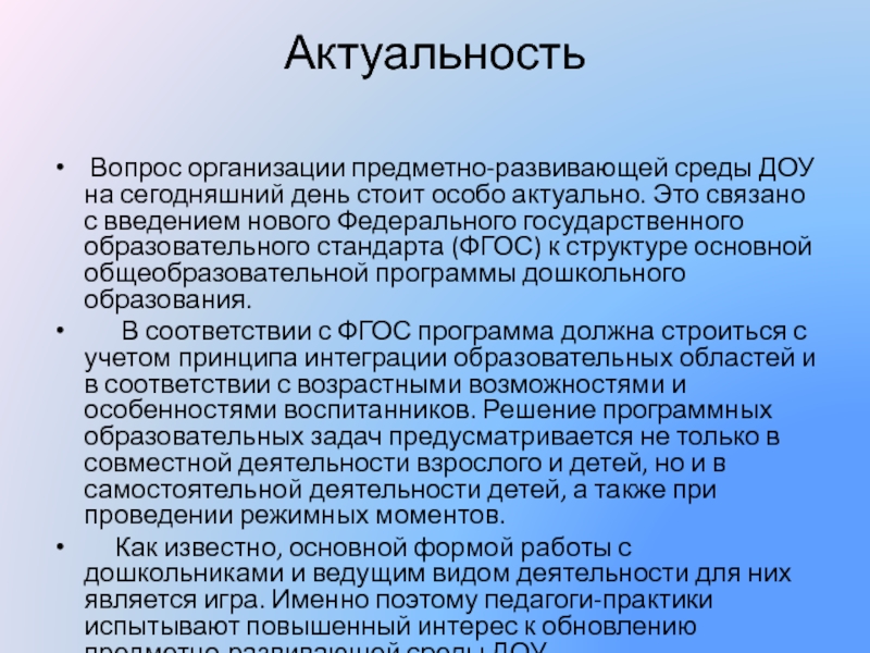 Слайд 2 Вопрос организации предметно-развивающей среды ДОУ на сегодняшний день стоит особо