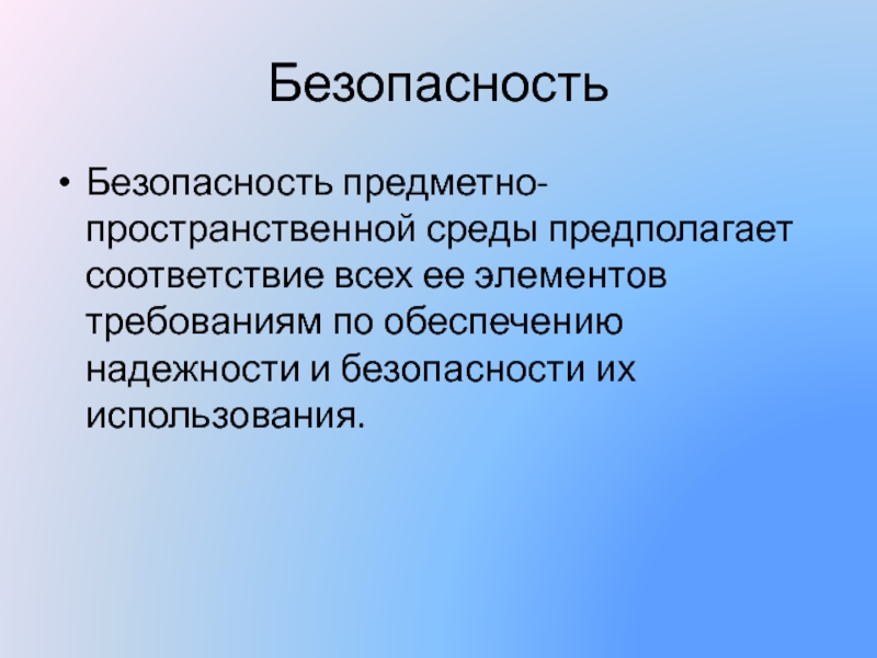 Безопасность предметно-пространственной среды предполагает соответствие всех ее элементов требованиям по обеспечению