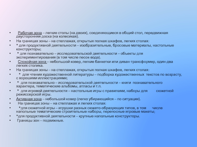 Слайд 17 Рабочая зона – легкие столы (на двоих), соединяющиеся в общий стол, передвижная