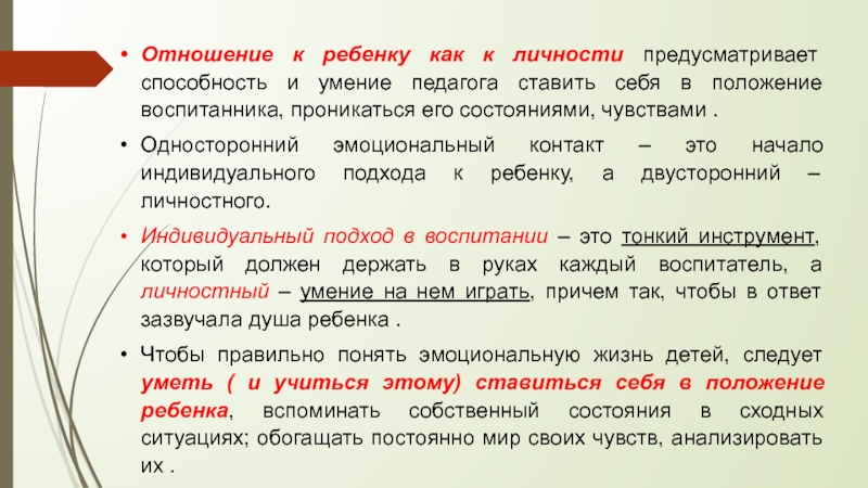 Слайд 7Отношение к ребенку как к личности предусматривает способность и умение педагога