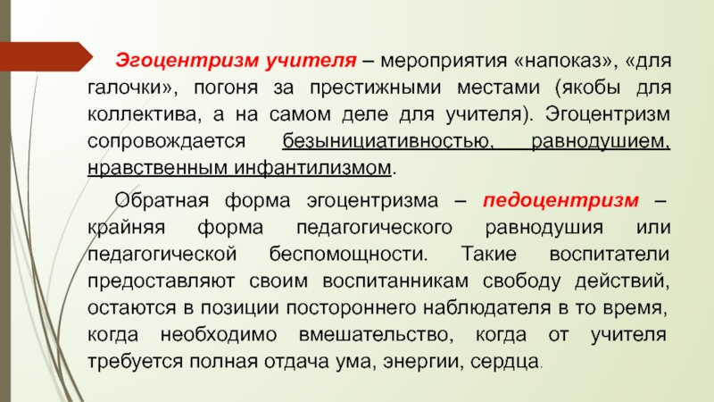 Обратная форма эгоцентризма – педоцентризм – крайняя форма педагогического равнодушия или педагогической беспомощности. Такие воспитатели предоставляют своим воспитанникам свободу действий, остаются в позиции постороннего наблюдателя в то время, когда необходимо вмешательство, когда от учителя требуется полная отдача ума, энергии, сердца.