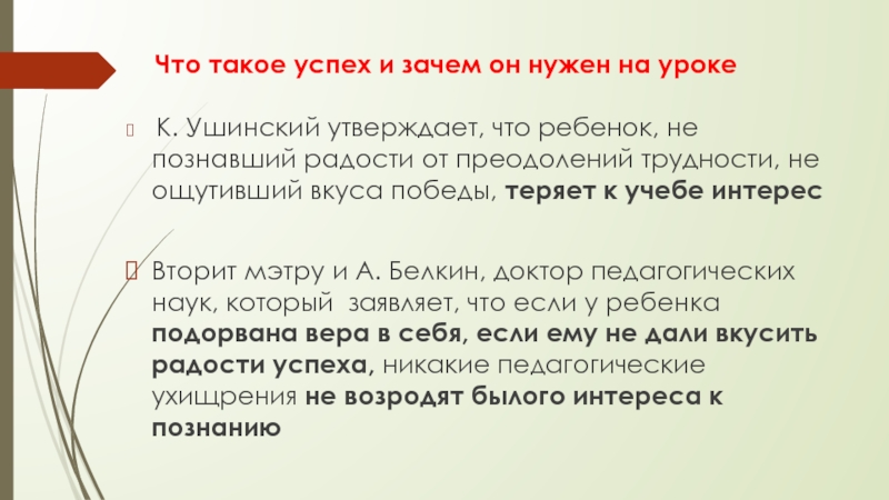 Вторит мэтру и А. Белкин, доктор педагогических наук, который заявляет, что если у ребенка подорвана вера в себя, если ему не дали вкусить радости успеха, никакие педагогические ухищрения не возродят былого интереса к познанию