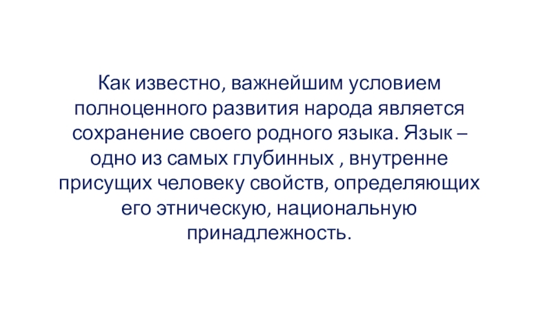 Слайд 2Как известно, важнейшим условием полноценного развития народа является сохранение своего родного