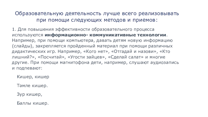 Для повышения эффективности образовательного процесса используются информационно- коммуникативные технологии. Например, при помощи компьютера, давать детям новую информацию (слайды), закрепляется пройденный материал при помощи различных дидактических игр. Например, «Кого нет», «Отгадай и назови», «Кто лишний?», «Посчитай», «Угости зайцев», «Сделай салат» и многие другие. При помощи магнитофона дети, например, слушают аудиозапись и подпевают: