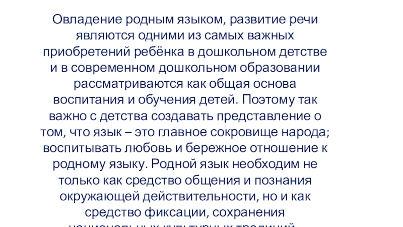 ребёнка в дошкольном детстве и в современном дошкольном образовании рассматриваются как общая основа воспитания и обучения детей. Поэтому так важно с детства создавать представление о том, что язык – это главное сокровище народа; воспитывать любовь и бережное отношение к родному языку. Родной язык необходим не только как средство общения и познания окружающей действительности, но и как средство фиксации, сохранения национальных культурных традиций .