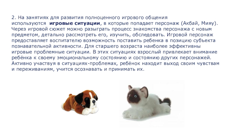 в которые попадает персонаж (Акбай, Мияу). Через игровой сюжет можно разыграть процесс знакомства персонажа с новым предметом, детально рассмотреть его, изучить, обследовать. Игровой персонаж предоставляет воспитателю возможность поставить ребенка в позицию субъекта познавательной активности. Для старшего возраста наиболее эффективны игровые проблемные ситуации. В этих ситуациях взрослый привлекает внимание ребёнка к своему эмоциональному состоянию и состоянию других персонажей. Активно участвуя в ситуациях-проблемах, ребёнок находит выход своим чувствам и переживаниям, учится осознавать и принимать их.