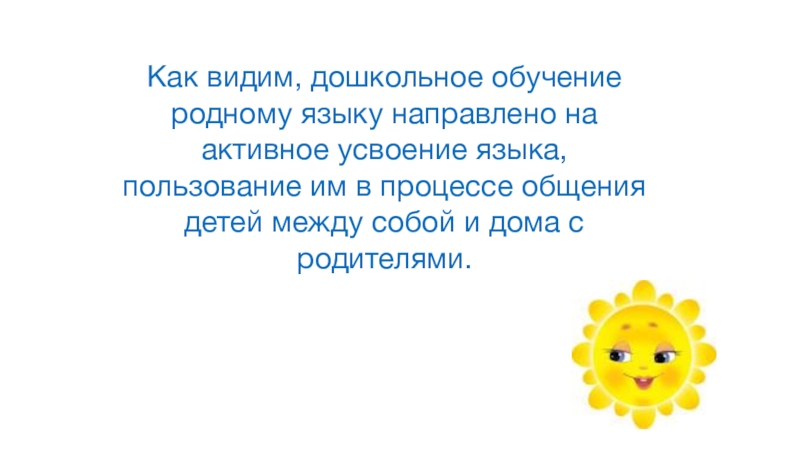 Слайд 14Как видим, дошкольное обучение родному языку направлено на активное усвоение языка,