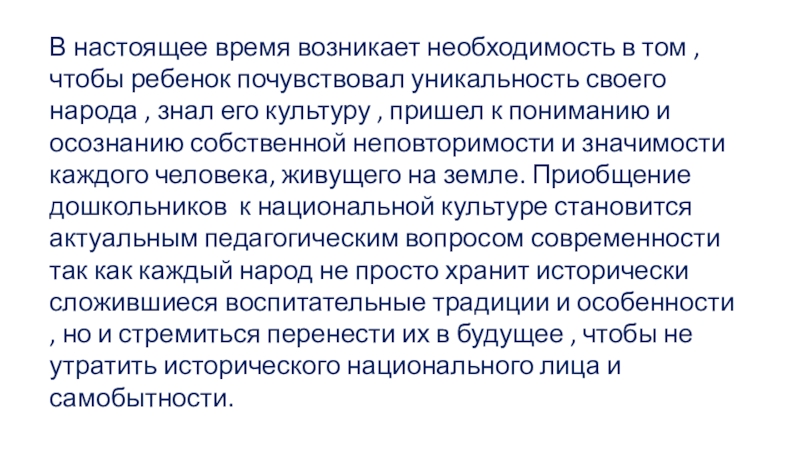 уникальность своего народа , знал его культуру , пришел к пониманию и осознанию собственной неповторимости и значимости каждого человека, живущего на земле. Приобщение дошкольников к национальной культуре становится актуальным педагогическим вопросом современности так как каждый народ не просто хранит исторически сложившиеся воспитательные традиции и особенности , но и стремиться перенести их в будущее , чтобы не утратить исторического национального лица и самобытности.