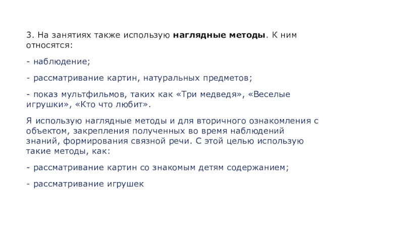 Я использую наглядные методы и для вторичного ознакомления с объектом, закрепления полученных во время наблюдений знаний, формирования связной речи. С этой целью использую такие методы, как: