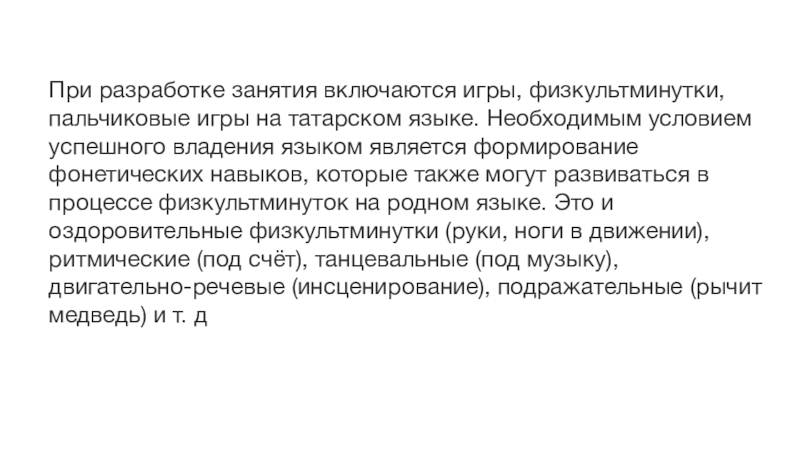 Слайд 12При разработке занятия включаются игры, физкультминутки, пальчиковые игры на татарском языке.