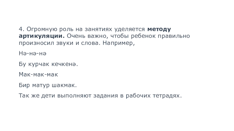 Слайд 114. Огромную роль на занятиях уделяется методу артикуляции. Очень важно, чтобы ребенок правильно