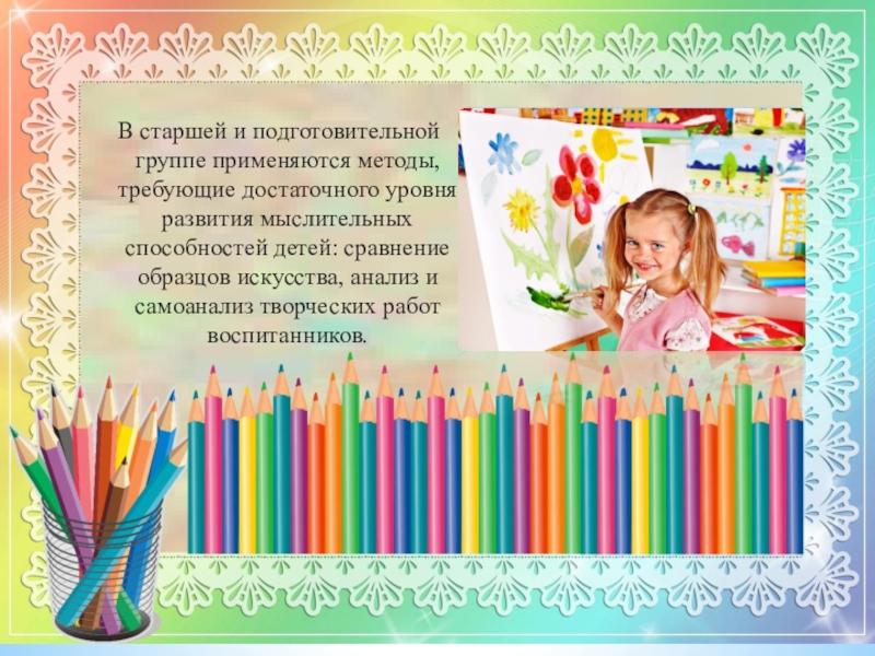 Слайд 6В старшей и подготовительной группе применяются методы, требующие достаточного уровня развития