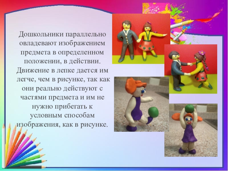 Слайд 8Дошкольники параллельно овладевают изображением предмета в определенном положении, в действии. Движение