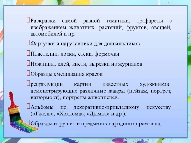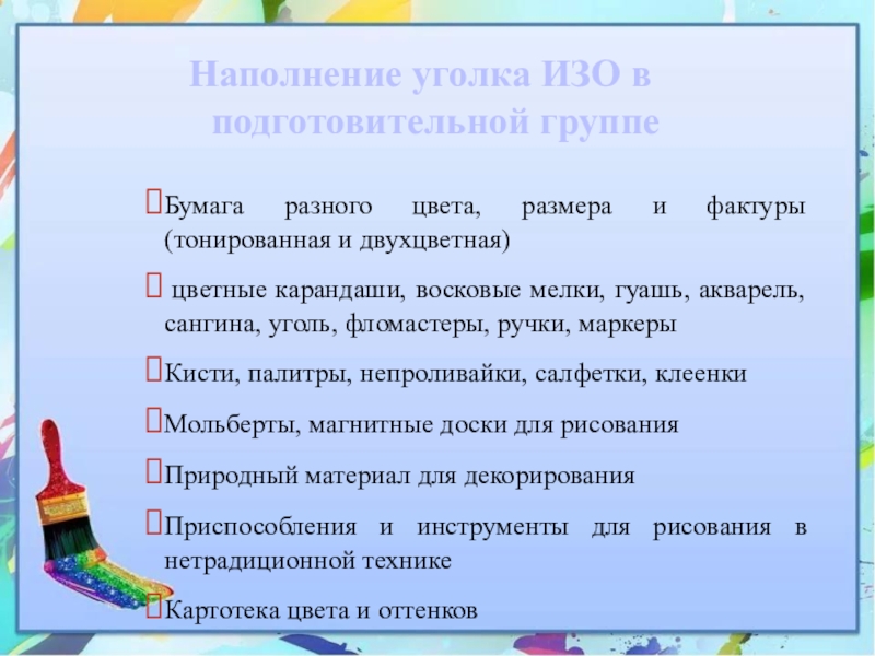 Слайд 11Наполнение уголка ИЗО в подготовительной группе