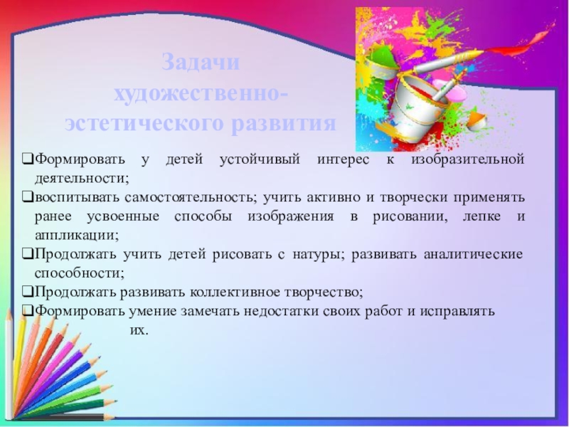 Цель художественно-эстетического развития дошкольников 6-7 лет — формирование у них эстетического идеала и художественного вкуса, а также способности к творчеству.