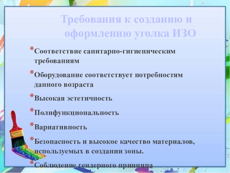 Слайд 10Требования к созданию и оформлению уголка ИЗО