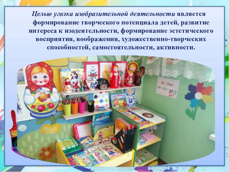 Слайд 9Целью уголка изобразительной деятельности является формирование творческого потенциала детей, развитие интереса