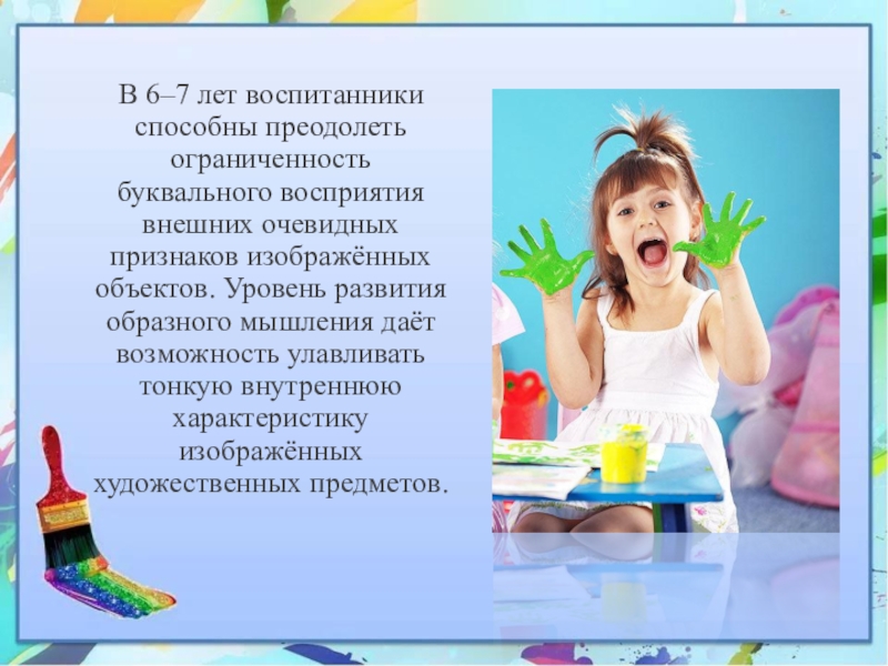 Слайд 7В 6–7 лет воспитанники способны преодолеть ограниченность буквального восприятия внешних очевидных
