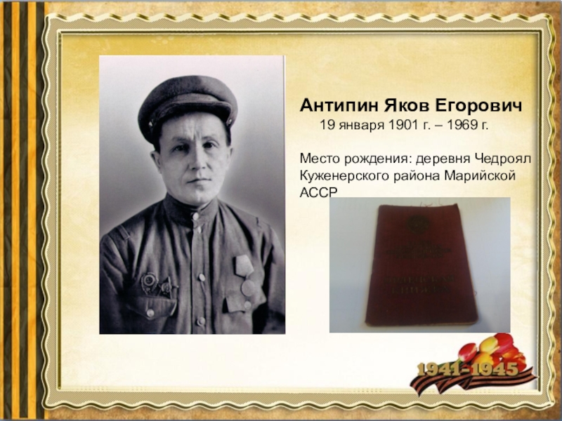 Антипин Яков Егорович 19 января 1901 г. – 1969 г.Место рождения: деревня Чедроял Куженерского района Марийской АССР