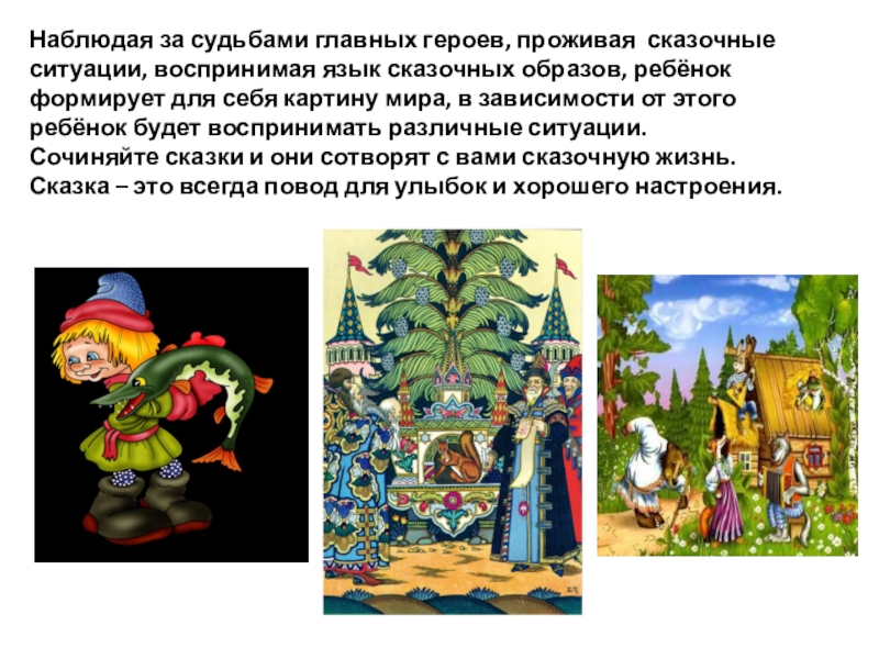Наблюдая за судьбами главных героев, проживая сказочные ситуации, воспринимая язык сказочных образов, ребёнок формирует для себя картину