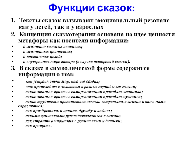 Функции сказок: 1.  Тексты сказок вызывают эмоциональный резонанс как у детей, так и у взрослых2.  Концепция сказкотерапии основана на