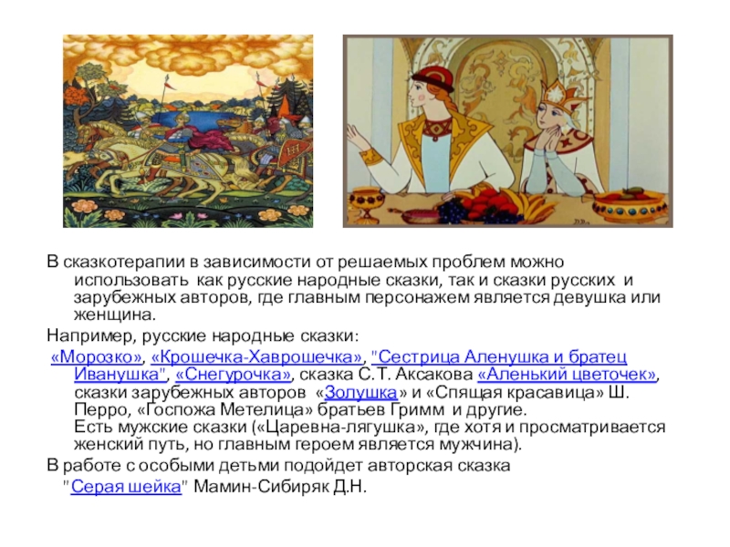В сказкотерапии в зависимости от решаемых проблем можно использовать  как русские народные сказки, так и сказки русских