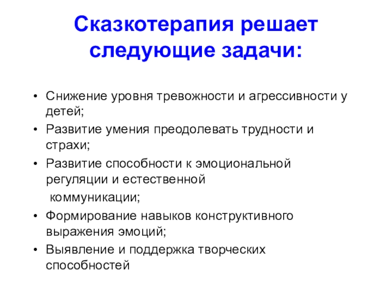 Сказкотерапия решает следующие задачи:Снижение уровня тревожности и агрессивности у детей;Развитие умения преодолевать трудности и страхи;Развитие способности к