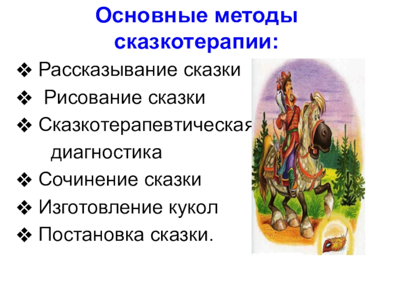 Основные методы сказкотерапии:Рассказывание сказки Рисование сказкиСказкотерапевтическая   диагностикаСочинение сказкиИзготовление куколПостановка сказки.