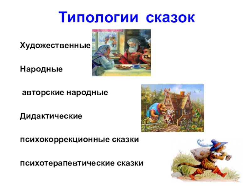 Типологии  сказокХудожественныеНародные авторские народныеДидактическиепсихокоррекционные сказкипсихотерапевтические сказки