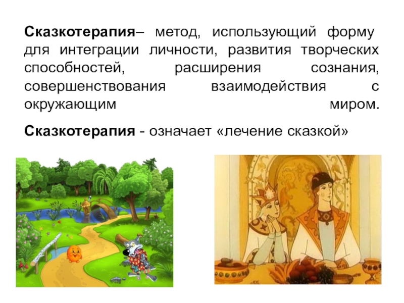 Сказкотерапия– метод, использующий форму для интеграции личности, развития творческих способностей, расширения сознания, совершенствования взаимодействия с окружающим миром. Сказкотерапия - означает «лечение сказкой»