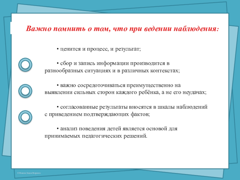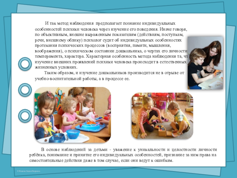 В основе наблюдений за детьми - уважение к уникальности и целостности личности ребёнка, понимание и принятие его индивидуальных особенностей, признание за ним права на самостоятельные действия даже в том случае, если они ведут к ошибкам.