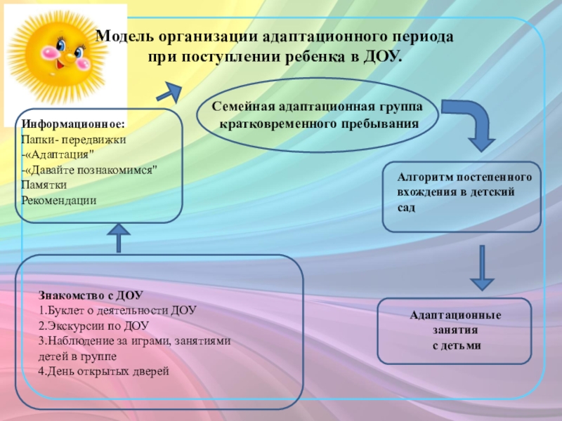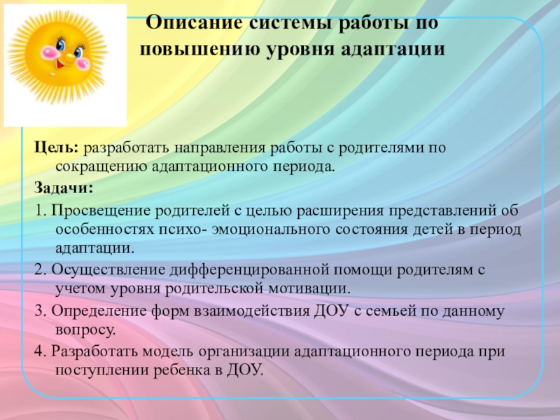 4.Разработать систему взаимодействия ДОУ и семьи по адаптации детей раннего возраста к условиям дошкольного учреждения.