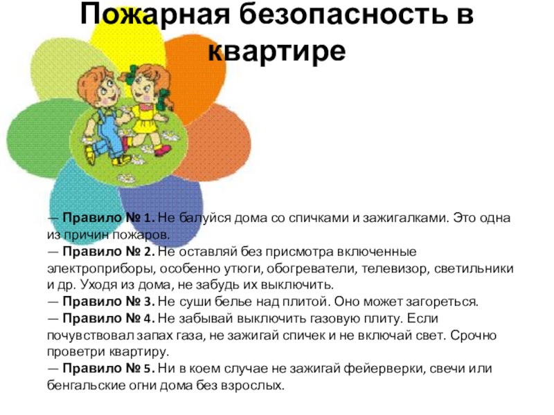 Большинство пожаров происходят в квартирах. Причина многих их них — детская шалость с огнем. Отсюда главное правило, которое нужно соблюдать всегда и везде: никогда не играй с огнем, не позволяй играть с ним другим ребятам.