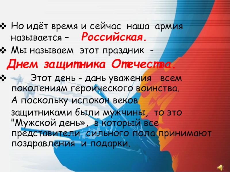 защитниками были мужчины, то это "Мужской день», в который все представители сильного пола принимают поздравления и подарки.