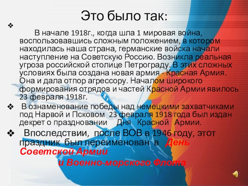 когда шла 1 мировая война, воспользовавшись сложным положением, в котором находилась наша страна, германские войска начали наступление на Советскую Россию. Возникла реальная угроза российской столице Петрограду. В этих сложных условиях была создана новая армия - Красная Армия. Она и дала отпор агрессору. Началом широкого формирования отрядов и частей Красной Армии явилось 23 февраля 1918г.
