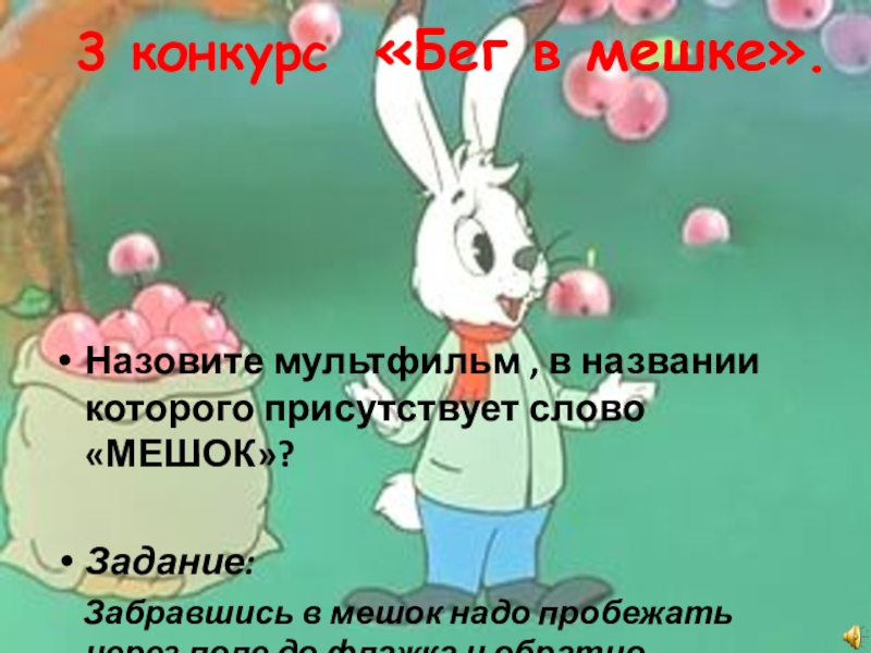 Забравшись в мешок надо пробежать через поле до флажка и обратно.