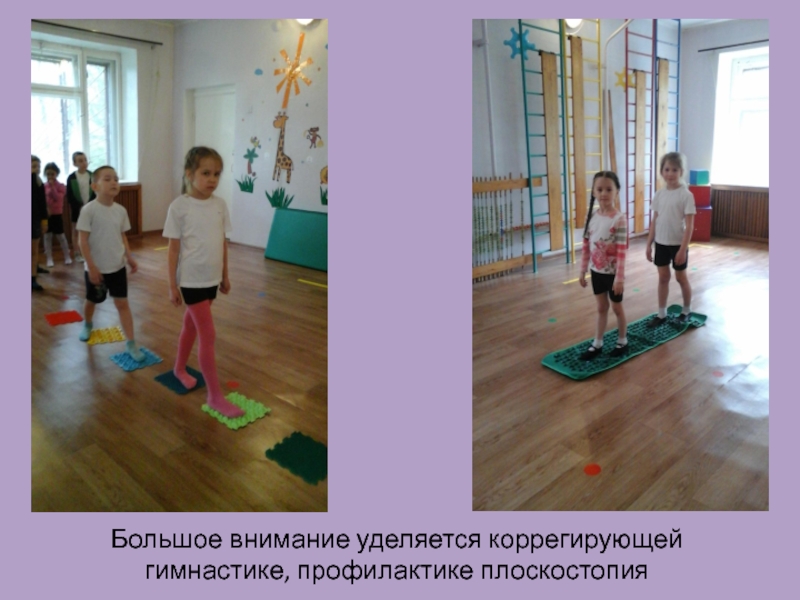 Слайд 3Большое внимание уделяется коррегирующей гимнастике, профилактике плоскостопия