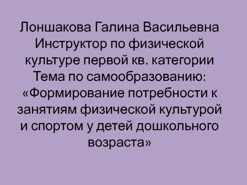 Лоншакова Галина Васильевна Инструктор по физической культуре первой кв. категорииТема по самообразованию: «Формирование потребности к занятиям физической культурой и спортом у детей дошкольного возраста»