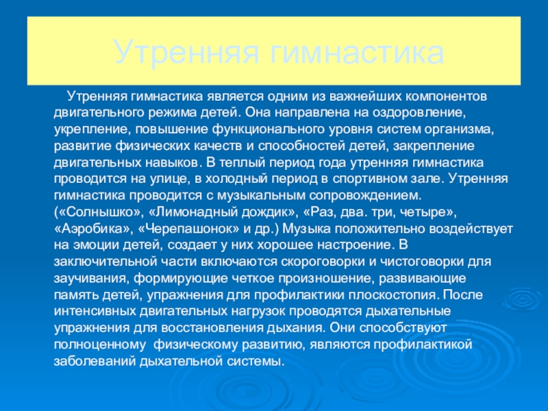 важнейших компонентов двигательного режима детей. Она направлена на оздоровление, укрепление, повышение функционального уровня систем организма, развитие физических качеств и способностей детей, закрепление двигательных навыков. В теплый период года утренняя гимнастика проводится на улице, в холодный период в спортивном зале. Утренняя гимнастика проводится с музыкальным сопровождением. («Солнышко», «Лимонадный дождик», «Раз, два. три, четыре», «Аэробика», «Черепашонок» и др.) Музыка положительно воздействует на эмоции детей, создает у них хорошее настроение. В заключительной части включаются скороговорки и чистоговорки для заучивания, формирующие четкое произношение, развивающие память детей, упражнения для профилактики плоскостопия. После интенсивных двигательных нагрузок проводятся дыхательные упражнения для восстановления дыхания. Они способствуют полноценному физическому развитию, являются профилактикой заболеваний дыхательной системы.