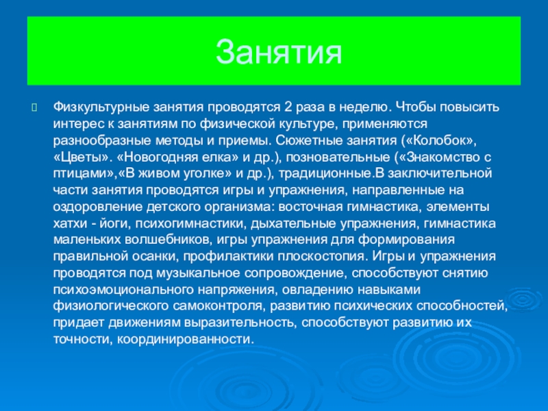 занятиям по физической культуре, применяются разнообразные методы и приемы. Сюжетные занятия («Колобок», «Цветы». «Новогодняя елка» и др.), позновательные («Знакомство с птицами»,«В живом уголке» и др.), традиционные.В заключительной части занятия проводятся игры и упражнения, направленные на оздоровление детского организма: восточная гимнастика, элементы хатхи - йоги, психогимнастики, дыхательные упражнения, гимнастика маленьких волшебников, игры упражнения для формирования правильной осанки, профилактики плоскостопия. Игры и упражнения проводятся под музыкальное сопровождение, способствуют снятию психоэмоционального напряжения, овладению навыками физиологического самоконтроля, развитию психических способностей, придает движениям выразительность, способствуют развитию их точности, координированности.