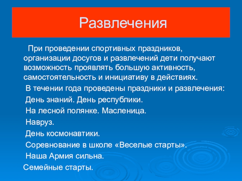 развлечений дети получают возможность проявлять большую активность, самостоятельность и инициативу в действиях.