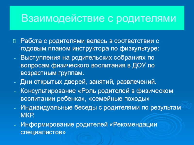 Выступления на родительских собраниях по вопросам физического воспитания в ДОУ по возрастным группам.