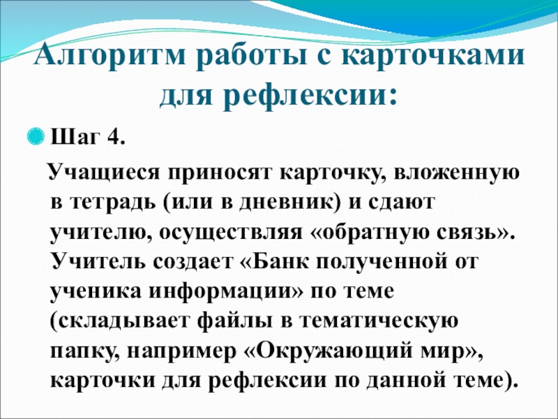 вложенную в тетрадь (или в дневник) и сдают учителю, осуществляя «обратную связь». Учитель создает «Банк полученной от ученика информации» по теме (складывает файлы в тематическую папку, например «Окружающий мир», карточки для рефлексии по данной теме).