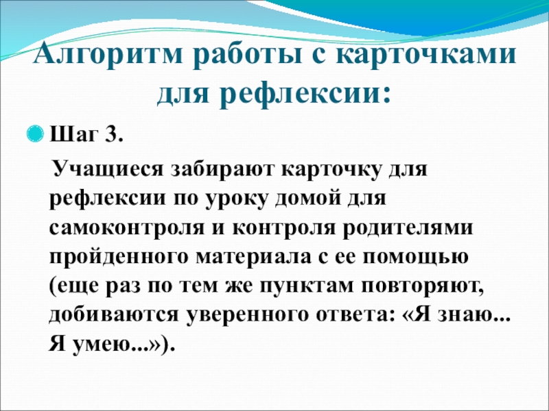 карточку для рефлексии по уроку домой для самоконтроля и контроля родителями пройденного материала с ее помощью (еще раз по тем же пунктам повторяют, добиваются уверенного ответа: «Я знаю... Я умею...»).
