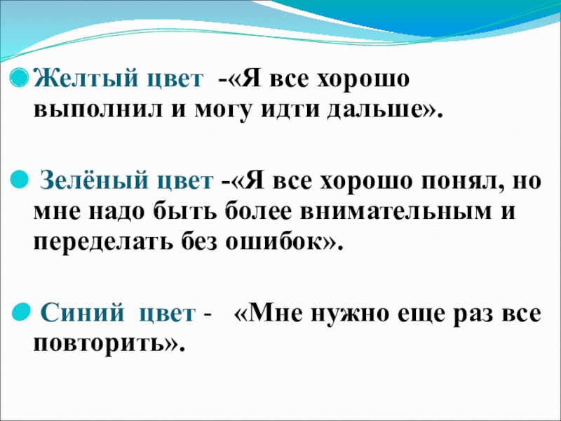 Слайд 21Желтый цвет -«Я все хорошо выполнил и могу идти дальше».