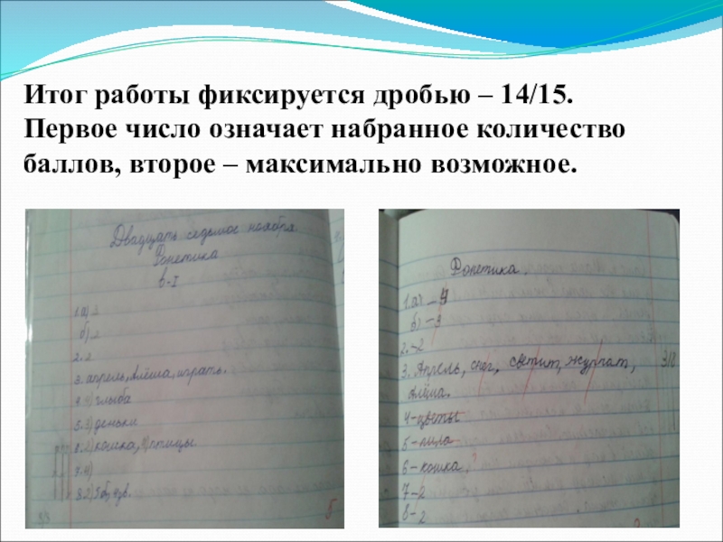 Итог работы фиксируется дробью – 14/15.