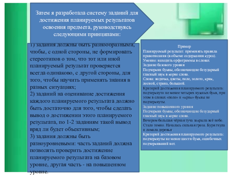 Затем я разработала систему заданий для достижения планируемых результатов освоения предмета, руководствуясь следующими принципами: